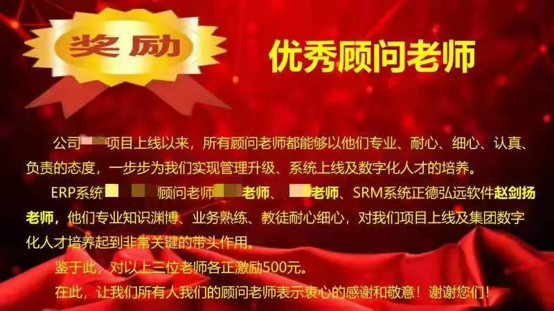 近日,海聯(lián)金匯科技股份有限公司(以下簡(jiǎn)稱“海聯(lián)金匯”)舉辦隆重項(xiàng)目表彰會(huì),正遠(yuǎn)軟件SRM項(xiàng)目經(jīng)理 趙劍揚(yáng),以熟練的供應(yīng)鏈知識(shí),扎實(shí)的技術(shù)功底,盡心、盡職、盡責(zé)的實(shí)施服務(wù),與SAP兩位實(shí)施顧問(wèn)共同榮獲海聯(lián)金匯“優(yōu)秀顧問(wèn)老師”稱號(hào),并獲得500元紅包獎(jiǎng)勵(lì)??上部少R!