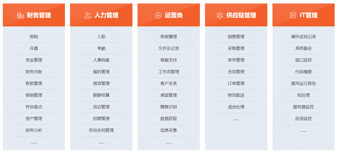 RPA機器人通過AI技術(shù)模擬人類行為,面向財務(wù)管理、人力資源管理、運營類管理、供應(yīng)鏈管理、IT管理等領(lǐng)域,完成大批量、高重復(fù)性工作任務(wù),可提升工作效率幾十倍。