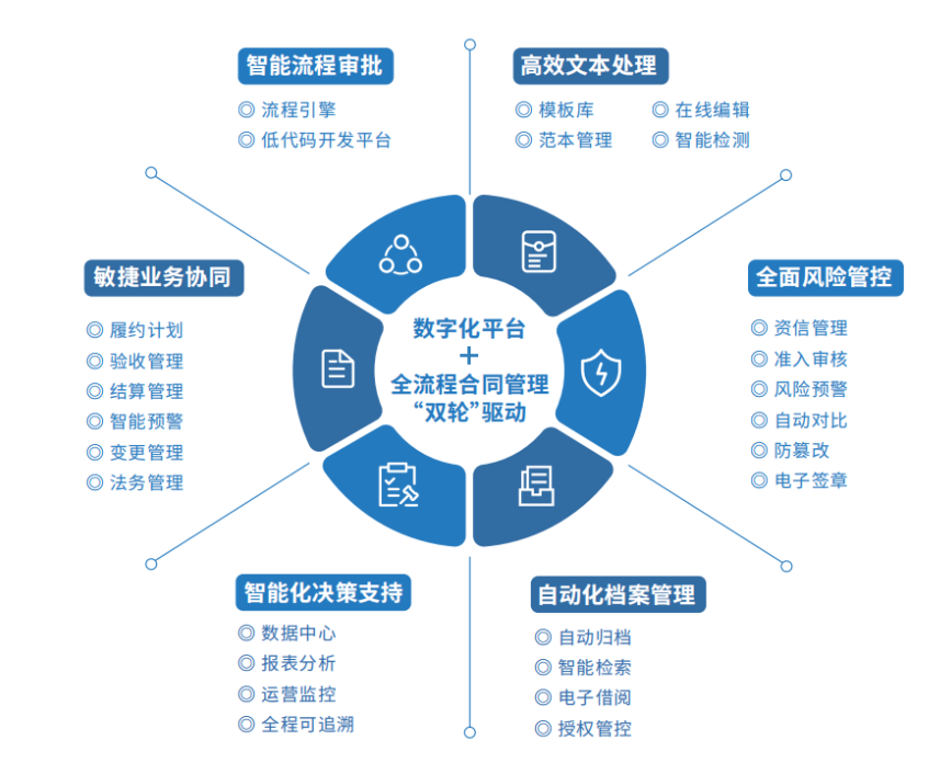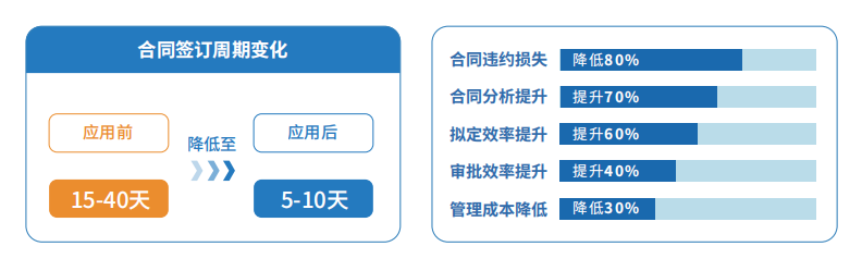 基于該解決方案,能夠幫助企業(yè)大幅提升合同管理效率,降低合同風(fēng)險(xiǎn),智能化管控合同臺(tái)賬,進(jìn)而實(shí)現(xiàn)合同管理的全面優(yōu)化,賦能企業(yè)管理效能提高。