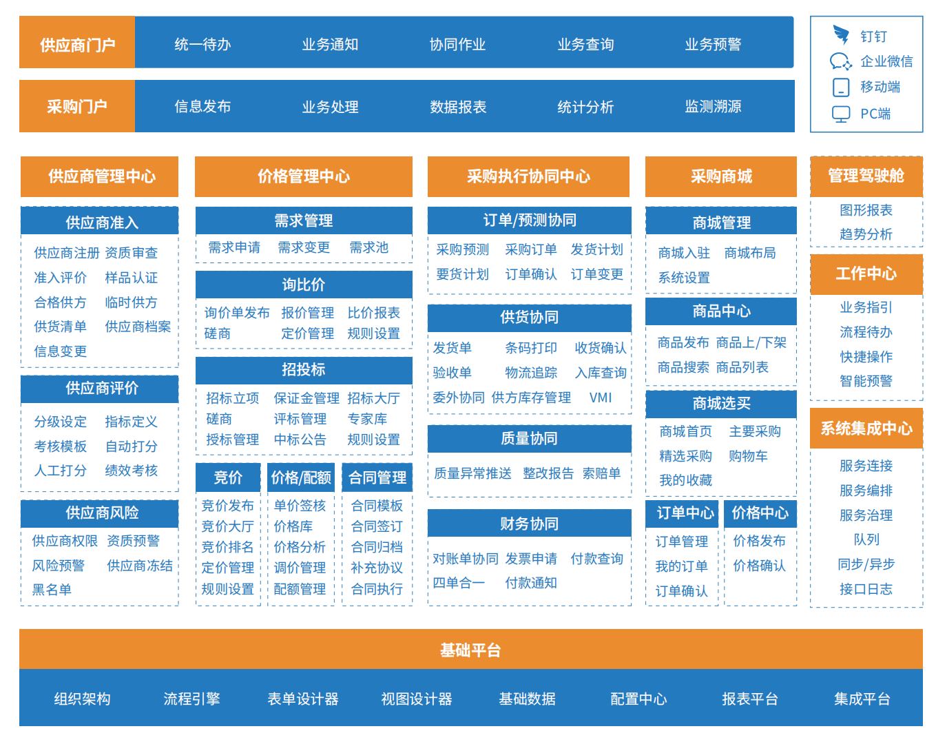 正遠(yuǎn)SRM數(shù)字化采購(gòu)平臺(tái),專注提升采購(gòu)全過(guò)程管理效能,構(gòu)建業(yè)務(wù)流程自動(dòng)化和全新協(xié)作模型,通過(guò)供應(yīng)商管理中心、價(jià)格管理中心、采購(gòu)協(xié)同中心、采購(gòu)商城、數(shù)字化決策中心、系統(tǒng)集成中心六大平臺(tái),為企業(yè)打造一個(gè)內(nèi)外統(tǒng)一的采供平臺(tái)。