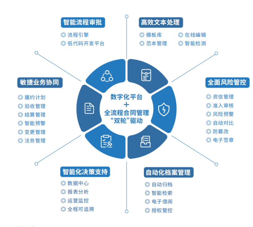 合同管理作為企業(yè)管理規(guī)范化中的關(guān)鍵內(nèi)容,易存在合同類型多、制度規(guī)范難落地、簽訂周期長(zhǎng)、業(yè)務(wù)追溯難等管理難點(diǎn),導(dǎo)致企業(yè)經(jīng)營(yíng)風(fēng)險(xiǎn)增大。